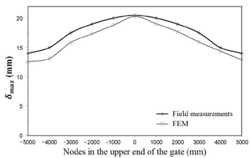 Fig. 15 shows the displacement profile at the upper end of the gate. Note that a good agreement is obtained between the numerical results and the actual measurements [20]. From a practical point of view a maximum displacement of 22 mm means that the gate is leaking as such displacement goes beyond the allowable value of 5.5 mm.