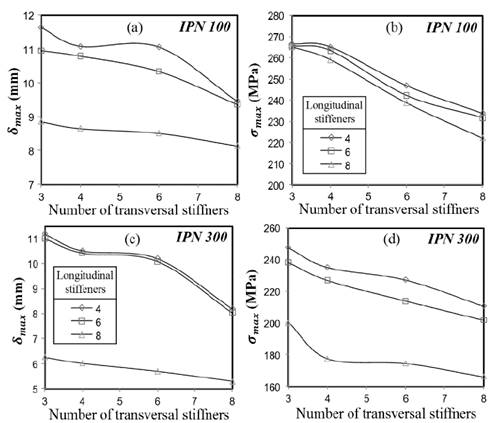 Fig. 16 shows the maximum displacements and stresses attained for the radial gate with stiffeners in both directions. These results are presented for the gate stiffened with IPN100 (Figs. 16a and 16b) and IPN300 (Figs. 16c and 16d). The distribution of the stiffeners was even in both directions. There is a reduction in the out-of-plane displacements of the gate after increasing the number of stiffeners, as well as after increasing the size of the stiffener. Similar results are observed for the maximum stresses. All the structural elements (plate and stiffeners) are subjected to bending, therefore an increase in the second moment of area of the stiffener leads to redistribution of the stresses in the gate, attaining a significant reduction.