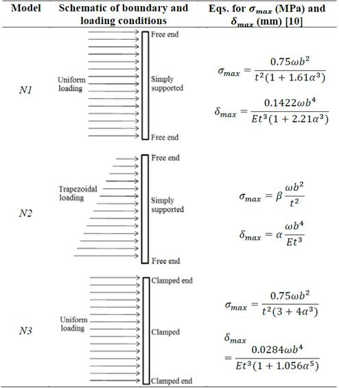 Fig. 3 shows a comparison for maximum displacements and stresses, between computed values and those obtained analytically with the equations proposed by [10] and summarized in Table 1. A good agreement between numerical and analytical results is achieved with a maximum difference of approximately 10%. It is worth noticing that the available formulas were obtained for stresses and displacements in the elastic range. Even though, the stresses are slightly higher than the corresponding yield strength of the material ( 𝑓 𝑦 = 260 MPa). The figure shows that for Model N1 the maximum radial displacement increases with the panel aspect ratio, 𝛼. For Model N2, with the same boundary conditions as Model N1 but different load distribution, the maximum radial displacement reduces about 30% compared to Model N1. For Model N3, clamped in all ends and uniformly loaded, the maximum displacement is reduced around 50% with regards to Model N1. These results demonstrate the impact of boundary and loading conditions on both, maximum displacements and maximum stress when modeling flat plates subjected to transverse loading. The results also show that both, the maximum displacement and the maximum stress increases with the panel aspect ratio for the three Models (N1, N2 and N3).