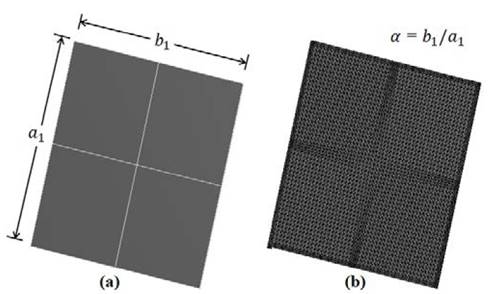 Figure 1: (a) Dimensions for Models N1, N2 and N3, and (b) Mesh for flat plates.