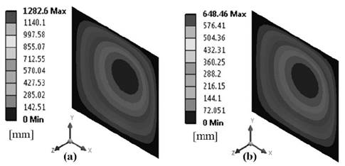 Table 1 also shows formulas for the calculation of maximum stresses 𝜎 𝑚𝑎𝑥 and displacements 𝛿 𝑚𝑎𝑥 [10]. Shell181 elements from the ANSYS element library [8] were used to model the plates. The dimensions of the plates were: width, 𝑏 1 = 10000 mm; height, 𝑎 1 = 10000 mm; and thickness, 𝑡 𝑝 = 20 mm (see Fig. 1a). An additional parametric study was conducted regarding the panel aspect ratio, 𝛼= 𝑏 1 / 𝑎 1 = 1.5, 2 and 2.5, maintaining constant the height, 𝑎 1 = 10000 mm. Fig. 1b shows a representative mesh of the flat plates, while Figs. 2a and 2b show the out-of-plane displacements plots obtained numerically for Models N1 and N2, respectively.
