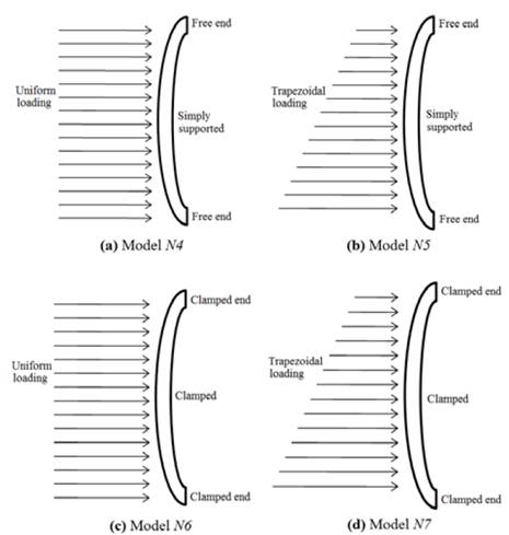 Continuing the methodology applied for flat plates, this section aims at investigating the influence of boundary and loading conditions on the structural response of curved plates subjected to transverse loading. Four additional models were developed as shown in Fig. 4, hence: Model N4 with the upper and lower ends free to move and the lateral ends simply supported, under uniform transverse loading (𝑝= 0.1 MPa); Model N5 with the upper and lower ends free to move and the lateral ends simply supported, under non-uniform (trapezoidal) transverse loading (𝑝 = 0.1 MPa); Model N6 clamped at four ends, under uniform transverse loading (𝑝= 0.1 MPa); and Model N7 clamped at four ends, under non-uniform (trapezoidal) transverse loading (𝑝 = 0.1 MPa).