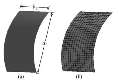 Fig. 4 shows a schematic view of boundary and loading conditions of the four models. Shell 181 elements from the ANSYS element library [8] were also used to model the plates. The dimensions of the plates were: width, 𝑏 2 = 10000 mm; height, 𝑎 2 = 10000 mm; plate radius, 𝑟= 9500 mm; and thickness, 𝑡 𝑝 = 10 mm. The panel aspect ratio, 𝛼= 𝑏 2 / 𝑎 2 (see Fig. 5a), was varied as 𝛼= 1, 1.5, 2 and 2.5 maintaining constant the height, 𝑎 2 = 10000 mm. Fig. 5b shows a representative mesh of the modeled curved plates.