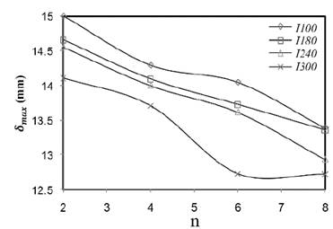 Figure 8: Maximum radial displacement 𝛿 𝑚𝑎𝑥 in the plane of symmetry of the curved plate (n = 2, 4, 6 y 8 transversal stiffeners).