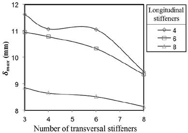 In this analysis, only one stiffener IPN100 was considered in the study. The number of the stiffeners in both directions was varied in both, the transverse direction (n= 3, 4, 6 and 8) and longitudinal direction (m= 4, 6 and 8). Fig. 9 shows a model with seven stiffeners, four in the longitudinal and three in the transversal direction. Boundary and loading conditions are the same as in the previous case.