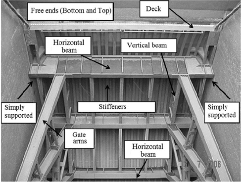Based on the above loading conditions, two design conditions arise: large displacements at the supported ends and high stress levels. As mentioned earlier, the situation may be solved by stiffening the gate by adding either transverse, longitudinal of both types of stiffeners.