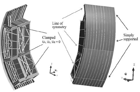 Various computational models for plates under transversal loading are elaborated using the finite element software ANSYS [8]. A detailed description of the employed numerical models can be found in [9]. These models are validated using a procedure that considers the influence of the plate geometry (flat and curved), boundary and loading conditions and finally considering the presence of transverse and longitudinal stiffening. Thereafter, a more complex numerical model is elaborated to investigate the influence of the stiffening on the out-of-plane displacements and stress distribution of a curved plate.