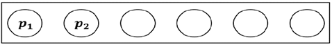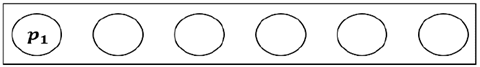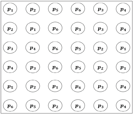 A modo de ejemplo, para la construcción de la matriz de segundo escalón se considera el conjunto de clientes 𝐶=[ 𝑝 1 , 𝑝 2 , 𝑝 3 𝑝 4 , 𝑝 5 , 𝑝 6 ], para el que se debe generar seis permutaciones, en la que en cada una se inicie con un cliente diferente; como se ve en la Fig. 8, la primera permutación comienza con 𝑝 1 , el cual se ubica en la posición (1,1) de la matriz (ver Fig. 11).