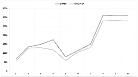 Las columnas GRASP y GRASP+SA contienen los resultados de la aplicación de la primera parte del método híbrido y de la totalidad del mismo respectivamente.