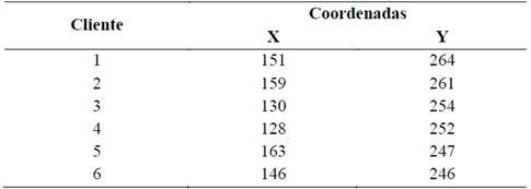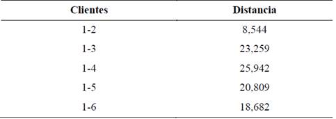 Con los valores correspondientes a las coordenadas de los clientes de la Tabla 1, se procede a calcular la distancia euclidiana entre 𝑝 1 y los demás clientes que aún no se asignan en la permutación, es decir ( 𝑝 2 , 𝑝 3 𝑝 4 , 𝑝 5 , 𝑝 6 ).