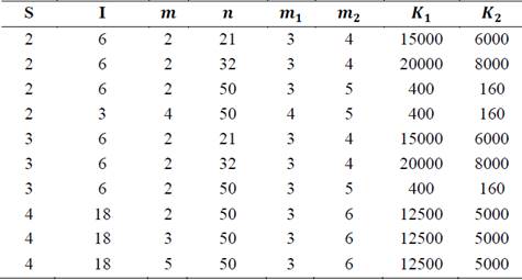 En [13] los autores elaboran un resumen de los conjuntos de casos pertinentes al 2E-CVRP el cual se presenta en la Tabla 3, donde se denotan la primera columna S(Conjuntos) y la segunda I (casos). En el caso de la primera fila, seis casos que forman parte del conjunto número dos, tienen como parámetros los valores propios de la fila en la que están presentes. El número de satélites se indican en la columna 𝑚, la columna 𝑛 muestra el número de clientes, las columnas 𝑚 1 y 𝑚 2 presentan el número de vehículos disponibles para el ruteo del primer y segundo escalón respectivamente, y las capacidades de los vehículos del primer y segundo escalón vienen dadas por 𝐾 1 y 𝐾 2 , respectivamente.