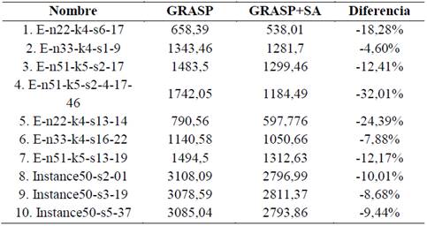 En la Tabla 4, se presentan los resultados correspondientes al valor de la distancia (costo) de las soluciones correspondientes a los casos especificados en la columna I, por medio del método híbrido desarrollado (GRASP+SA) y la primera etapa de éste mismo método, es decir, únicamente haciendo uso de GRASP.