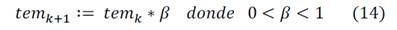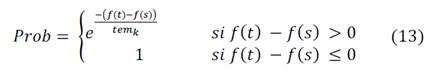 Donde 𝑓 𝑠 y ?? 𝑡 son los valores del costo asociados a las soluciones 𝑠 y 𝑡 respectivamente; y 𝑡𝑒𝑚 𝑘 representa la temperatura del sistema en la iteración 𝑘. Además, al analizar la expresión de probabilidad se reconoce como entre más alta sea la temperatura, mayor será la probabilidad de aceptar una solución que no mejora la actual, como la sustituta de 𝑠.
