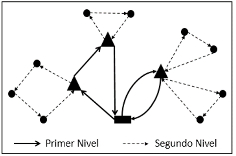El 2E-CVRP consta de dos niveles o escalones, y el modelo matemático, se enfoca en solucionar el ruteo para ambos de forma integral, a la vez que se considera minimizar el costo del problema; se entiende como ruta de primer nivel a una que conecta un depósito central con uno o más centros de distribución conocidos como satélites, y como ruta de segundo nivel a una que conecta a un satélite con uno o más clientes que requieren una demanda, las rutas del segundo escalón requieren ser asignadas a alguno de los satélites, mientras que las del primer escalón no. Se cuenta con dos flotas homogéneas de vehículos, una para cada nivel, siendo la flota del segundo nivel menor en capacidad respecto a la del primer nivel. Usualmente, restricciones de capacidad son consideradas para los satélites y vehículos. La demanda de cada cliente no puede ser dividida en los vehículos del segundo nivel; sin embargo, los vehículos del primer nivel pueden transportar la carga de uno o más clientes, así como servir más de un satélite en la misma ruta; cabe aclarar que los satélites pueden ser visitados por distintos vehículos y las entregas de estos pueden ser divididas. Finalmente, la carga debe ser consolidada en los satélites para su posterior envío a los clientes. En la Fig. 1 se evidencia una representación gráfica del 2E-CVRP:
