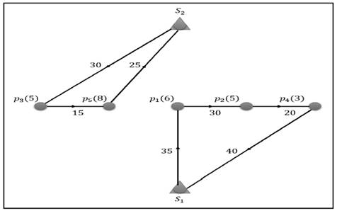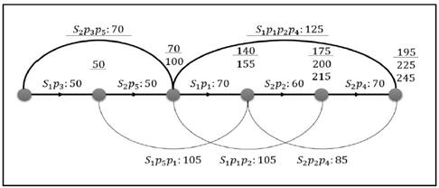 Cada uno de los arcos de la Fig. 3, representa un viaje asignado al satélite de menor costo, para el caso del arco 𝑝 1 𝑝 2 𝑝 4 el valor del viaje desde el satélite uno seria de 125 (resultado de 35+30+20+40), mientras que desde el satélite dos el valor sería de 135 (resultado de 50+30+20+35); por lo cual la asignación de menor costo corresponde al satélite uno. De tal manera que el camino más corto hasta el último nodo del grafo auxiliar, el cual toma un valor de 195, indica cual es la mejor manera de dividir la permutación, que para éste caso se encuentra demarcado por los dos arcos con línea acentuada, además se evidencia como si se hubiera dividido de otra forma, los costos hubieran aumentado como en el caso de los caminos que dan un valor de 225 y 245. Por lo que el resultado gráfico del procedimiento de división aplicado al ejemplo se evidencia en la Fig. 4.