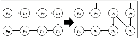 A modo de ejemplo, en la Fig. 5, se evidencia como los arcos que conectan a los clientes ( 𝑝 11 , 𝑝 7 ) y ( 𝑝 4 , 𝑝 9 ) son expelidos; para dar lugar a los arcos ( 𝑝 11 , 𝑝 4 ) y ( 𝑝 7 , 𝑝 9 ), los cuales hacen parte de la nueva ruta, en la cual además, se ve claramente como el sentido de los arcos ( 𝑝 4 , 𝑝 2 ), ( 𝑝 2 , 𝑝 1 ), ( 𝑝 1 , 𝑝 5 ), ( 𝑝 5 , 𝑝 8 ) y ( 𝑝 8 , 𝑝 7 ) se dan en dirección contraria respecto a los arcos de la ruta no modificada.