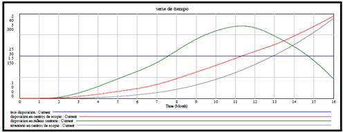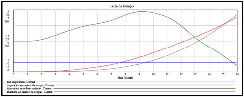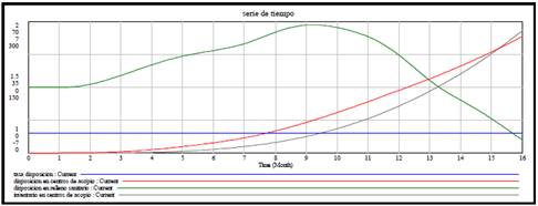 El segundo grupo de estrategias designadas como estrategias implementadas, son: responsabilidad extendida del productor [14], estímulos a la ciudadanía [15,16] y tarifa de recolección de residuos [17]. Estas estrategias han sido utilizadas en trabajos con dinámica de sistemas que tienen cierta relación con nuestra investigación y que fueron direccionadas a influenciar la tasa de disposición lo que nos permitió evaluar los objetivos dos y tres de la política. En la Fig. 11 se observa la forma cómo fueron implementadas en el Modelo, en el diagrama de niveles y flujos. Para observar el comportamiento inicial o natural del sistema socio-ambiental de RAEE, las estrategias las cuales influyen en la tasa de disposición, presentaron valores igual a cero (Fig. 12). Luego de la simulación podemos deducir como la disposición en centros de acopio y el inventario de material en centros de acopio se incrementó a medida que con el tiempo.