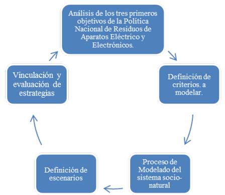 La metodología para el desarrollo del presente trabajo se dividió en cinco fases: interpretación de los tres objetivos de la política nacional de residuos de aparatos eléctricos y electrónicos RAEE. La definición de criterios a modelar, el proceso de modelado del sistema socio-natural, la definición de escenarios tendenciales y por último la definición de estrategias para la calificación del programa. Como muestra la Fig. 1.