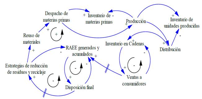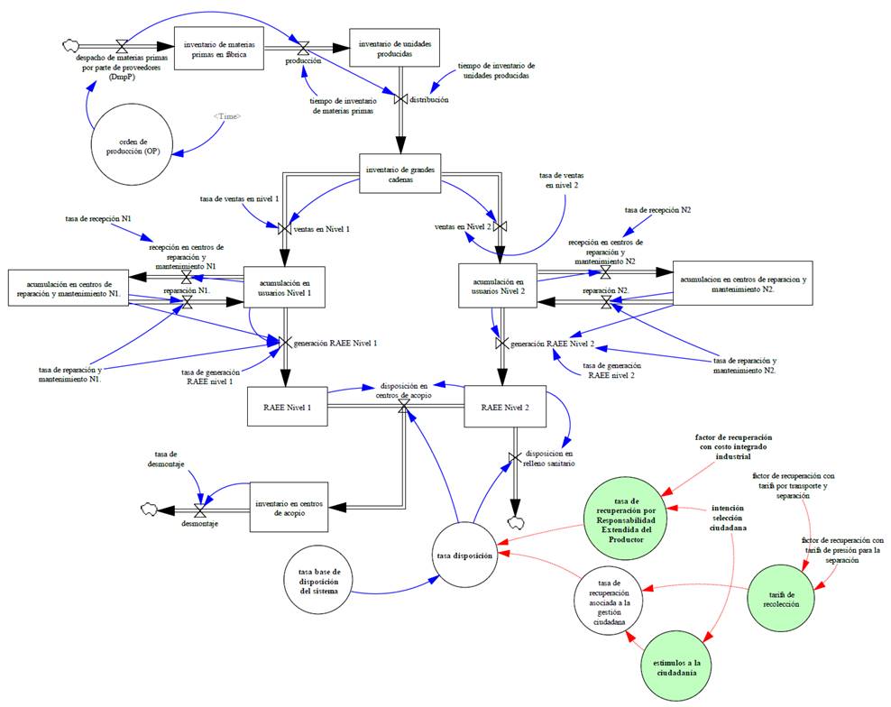 La Dinámica de Sistemas es una metodología para el análisis y resolución de problemas, desarrollada en el MIT y con amplio marco referencial [6,7,19]. En Dinámica de Sistemas, se concibe cualquier aspecto del mundo como la interacción causal entre atributos que lo describen. De esta forma, se construyen representaciones sistémicas con flechas y puntos, denominadas diagramas causales, que capturan todas las hipótesis propuestas por el modelador, desde las que se puede aprender del sistema para intervenir sobre él en el ejercicio de decisión [8,20]. El modelamiento con Dinámica de sistemas para la gestión de residuos incluyendo los RAEE, recientemente ha sido utilizado en investigaciones similares [5,9-12]. Esta consiste en 3 etapas, conceptualización del problema, Formulación del modelo y evaluación [13].
