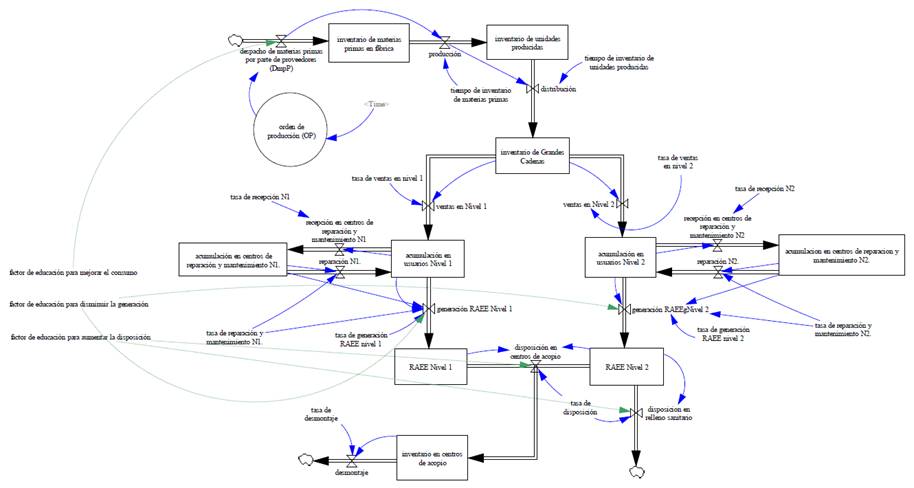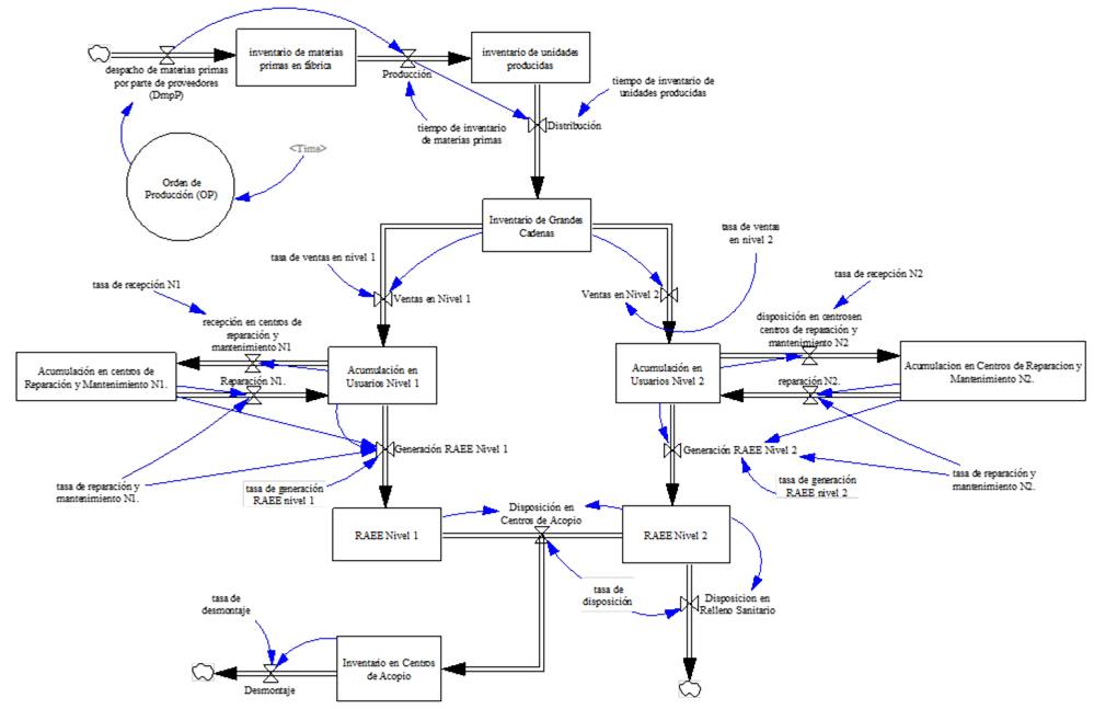 Con base en la revisión bibliográfica caracterizamos y determinamos la estructura del sistema socio-natural para los residuos de aparatos eléctricos y electrónicos (RAEE). Consecutivamente y a partir del entendimiento de dicha estructura construimos el diagrama de niveles y flujos en el que fueron vinculados el conjunto de estructuras y procesos de manera general, para la adquisición, almacenamiento y trasformación de entradas en salidas así como las reglas de decisión que rigen los flujos para el sistema de RAEE, vea Fig. 3. Concretamente el diagrama está constituido por 10 variables de estado (niveles), 14 variables de flujo y 2 variables auxiliares las cuales se describen junto con las ecuaciones del modelo en las Tablas 1 y 2.