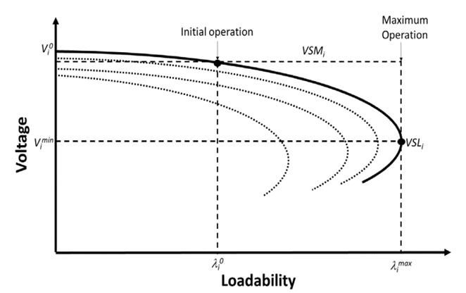 The VSLs and VSMs are found by the algorithm, representing the operating risk from the starting point to the limits as shown in Fig. 2[1]. In this figure, the parameter λ i max is the maximum load at bus i, λ i 0 is the initial load at bus i, VSLi is the voltage stability limit at bus i, and VSMi is the voltage stability margin at bus i. As multiple VSMs can be calculated by measuring the distances from the initial operating point to the multiple maximum VSLs, the critical margin and limit are selected from the minimum distance obtained in the simulation.