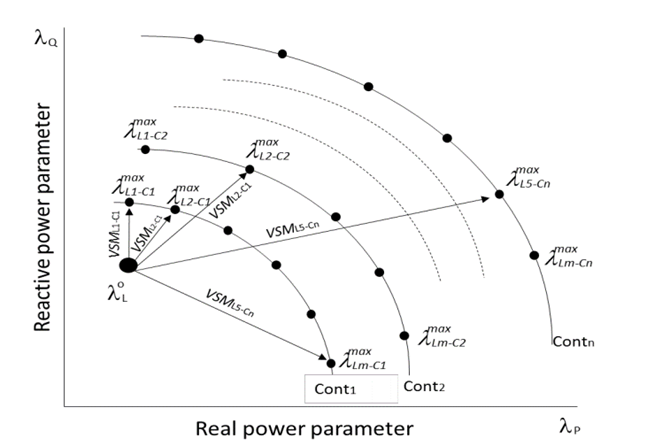 The PQ curves represent the VSRs as real and reactive power values of the maximum load consumption and generator supply from a bus, area, or power system. Fig. 3 shows the operating point and the maximum real and reactive power consumption in a bus of the power system, where λ L 0 is the initial parameters of load and generation, calculated using the initial PF in P2 and stored in S1. This curve shows the VSL and VSM calculated for each contingency in the power system.