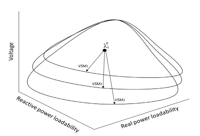 Fig. 4 shows three-dimensional curves used to display the voltage changes according to the variation of the real and reactive powers of loads and generators. The regions can be created for a load bus, different loads in an area, or the entire system. This figure illustrates the operating point λ 0 L in the stable region, the different voltage boundaries, and multiple critical VSLs in different layers, which represent the risk of operation. VSM 1 is the voltage stability margin measured from the operating point to a maximum point in layer 1, VSM 2 is the voltage stability margin measured from the operating point to a maximum point in layer 2, and VSM 3 is the voltage stability margin measured from the operating point to a maximum point in layer 3. Multiple layers with all the VSLs can also be determined by the algorithm to evaluate the risk of different changes in the power system.