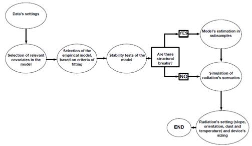 Our methodology focuses on the problem of estimating the expected global radiation on a horizontal surface, given a set of weather-related covariates. The proposal consists of five steps: i) selection of relevant variables to be included in the model, ii) selection of a parsimonious empirical model, iii) stability tests of the model’s parameters, iv) simulation of operation-scenarios, conditional on weather parameters and v) generation of the output variable to be included in traditional project management designs (see Fig. 1).
