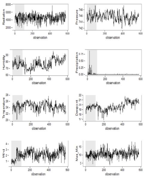 We assume a linear relationship1 between the total amount of radiation y t , and a set of weather-related covariates 𝑥 𝑖,𝑡 i=1,2,…k, . In our empirical implementation, we imposed a maximum possible number of covariates 𝑘 𝑚𝑎𝑥 =7, following data availability from regular records of a meteorological observatory. Working explanatory variables were: temperature, humidity, dew point, wind velocity, precipitation level, atmospheric pressure, and an indicator of cloudiness (the highest minus the lowest temperature within a day). In all cases, except for the last one, the recorded frequency of each variable was half an hour, and therefore we needed to transform the original series to daily averages to obtain standardized frequencies among all the covariates and the dependent variable2. This dependent variable was constructed as the cumulated level of radiation collected by the panel during the course of a day. We had measures of the level of radiation collected at half hourly intervals. These measures were aggregated by integrating out the area below the curve in Fig. 2 for each day within the sample.