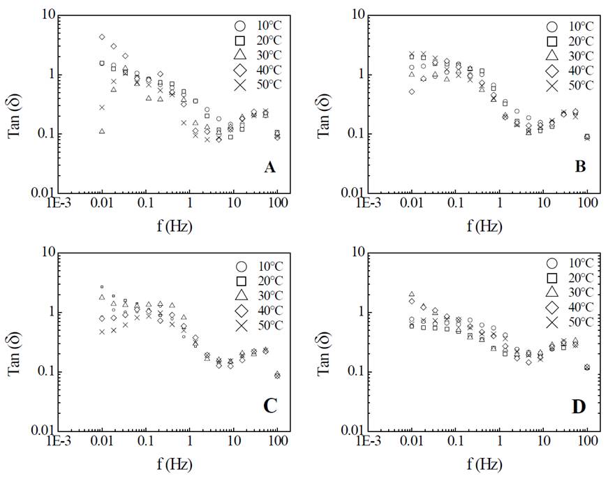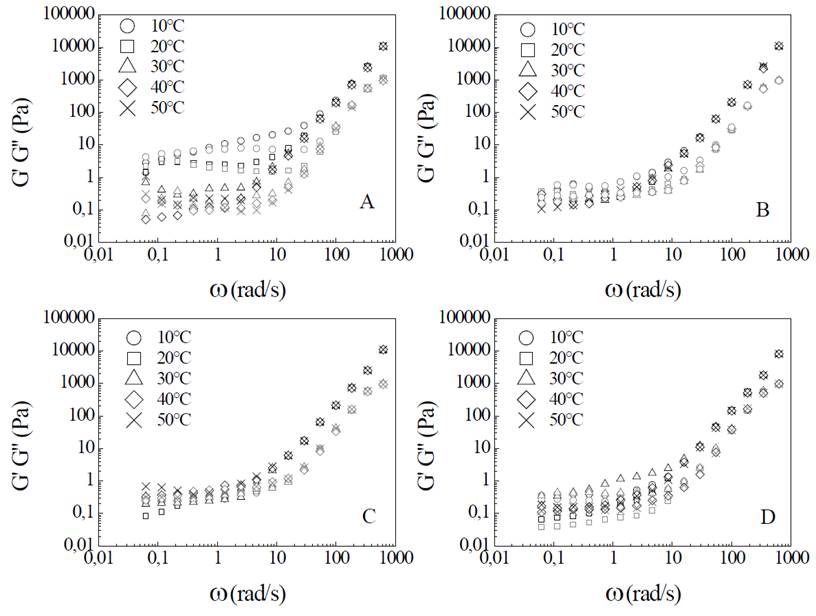 The adjustment of K’, K", n’ and n” (eq. 6 and 7) to the Arrhenius equation showed that the viscoelastic behavior is not satisfactorily described by this model (R2<0.5), then there is no linear dependence between the viscoelastic parameters studied and the temperature.