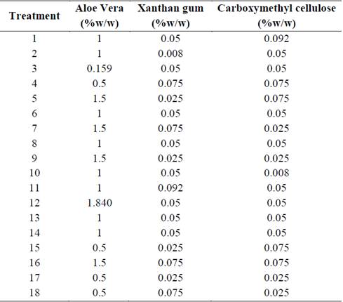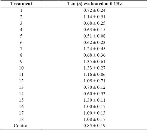 Values of tan (δ) under the established frequency and temperature conditions were in the range of 0.5-0.7 and were achieved with treatments 3, 4, 6, 8, 13 and 14. Treatments 6, 8, 13 and 15 correspond to the central point of the experimental design, that is, XG and CMC concentrations of 0.05 %w/w and 1 %w/w AV. Treatments 3 and 4 correspond to equal concentrations of gum (0.05 %w/w and 0.075% w/w, respectively), and lower AV concentrations (<0.5 %w/w). Therefore, it is evident that the desirable viscoelastic properties (tan (δ) <1) are achieved at gum concentrations ≥ 0.05% w/w in the same proportion and a maximum concentration of 1% w/w AV.