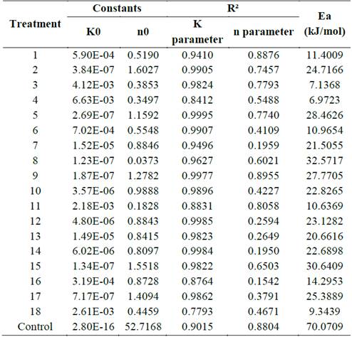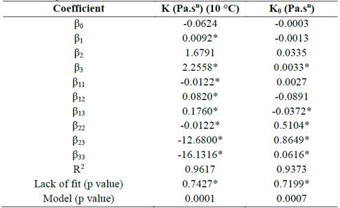 The parameters of the consistency coefficient and frequency factor fitted to the quadratic model are shown in tab. 3. High coefficients of determination (R2>0.90), and no significant lack of fit was obtained, indicating that the model is adequate to explain the behavior of these variables.