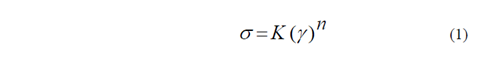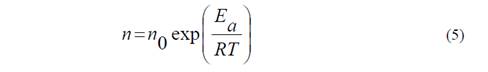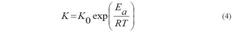 In this equations K0 is the frequency factor (Pa.sn), n0 is the fit parameter associated with the flow index, Ea is the activation energy (J/mol), R is the gas constant (8.314 J/mol K) and T is the absolute temperature (K). The constants K0 , n0 and Ea were obtained from an exponential fit [20, 23].