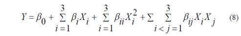 The experimental design was evaluated using a multifactorial ANOVA with a level of significance of α=0.05. The response surfaces were calculated using the following second-order model (eq. 8).