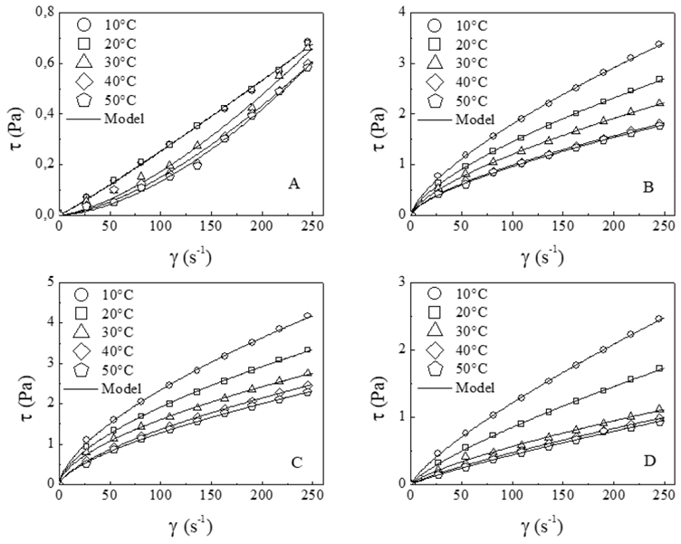 Flow curves of sweet corn beverage were obtained using a viscometer DV-III Ultra (Brookfield, USA), with a geometry of coaxial cylinders, at temperatures of 10, 20, 30, 40 and 50°C, which was controlled by a thermostated bath. Three scans of shear rate (γ) in the range from 0 to 100 s-1 were performed - first ascending, then descending and finally ascending again - in order to eliminate possible thixotropy in the sample. The data of the last curve obtained were taken and held for every procedure in triplicate [7,21,22]. The experimental values of the different flow curves obtained were fitted to Power Law (eq. 1), Herschel-Bulkley (eq. 2) and Casson (eq. 3) models.