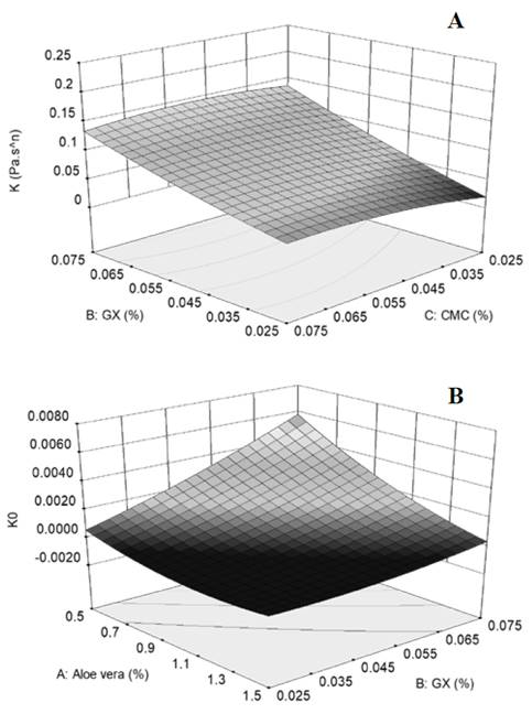 Figure 2: Response Surfaces. A: Consistency coefficient (K) and B: frequency factor (K0) of sweet corn beverages.