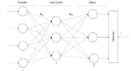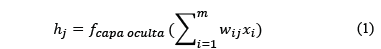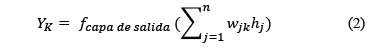Como se aprecia en la Fig. 2 en la arquitectura de las RNA, los flujos de información están estrictamente hacia adelante. Las expresiones básicas de las salidas de la capa oculta y la capa de salida son las siguientes ecuaciones (1) y (2):