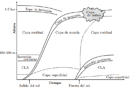 La capa de mezcla es uno de esos parámetros claves para el análisis de la calidad del aire y de los contaminantes [13]. Es la parte de la atmósfera que está directamente afectada por los sucesos en la superficie y rige la mayoría de las variables meteorológicas. Su espesor es muy variado; puede estar entre decenas de metros a unidades de kilómetros (corresponde al 20 % de la troposfera en promedio); y generalmente responde a los forzamientos de esa superficies en periodos del orden horario o menos [14]. En general, la concentración de cualquier trazador dentro de la capa limite varia debido a los cambios en el volumen de mezcla [15]