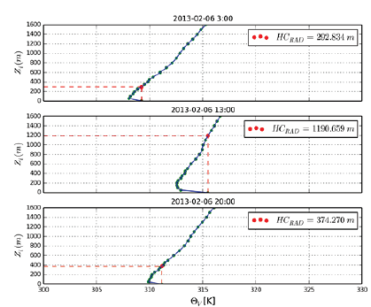 La Fig. 5 representa un ejemplo de la aproximación en la altura de la capa de mezcla, a partir del método de la parcela, para el día 6 de febrero de 2013, a tres horas distintas (3, 13 y 20). Se evidencia que la altura máxima coincide con las horas donde se registra mayor radiación solar incidente.
