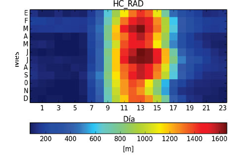 Figura 6: Ciclo diario anual altura capa de mezcla, periodo 2013-2016.