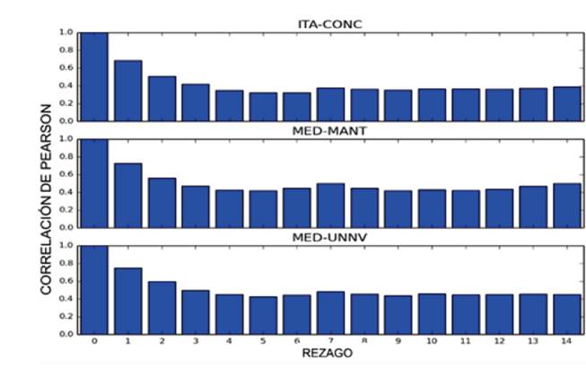 La Fig. 8 esquematiza el autocorrelograma rezagado 15 días para el PM2.5, en ésta se evidencia que la concentración tiene una correlación relativamente alta consigo mismo hasta con tres días de rezago, es decir, que los niveles de contaminación de los tres días anteriores influyen en la concentración del contaminante el día actual. Basado en esta relación, se ha tomado como variables de entrada al modelo las concentraciones de PM2.5 de los tres días anteriores.