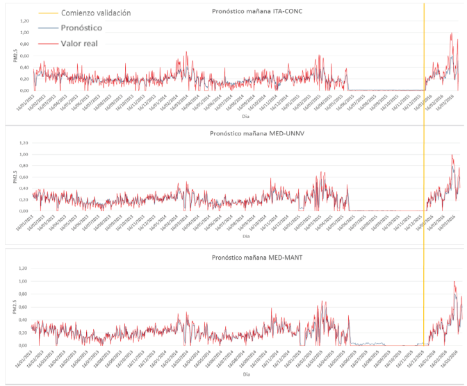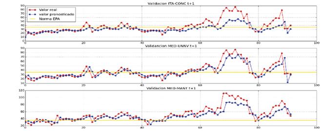 En La Fig. 10, se muestra los resultados del pronóstico para las 3 estaciones, el periodo usado para calentar y calibrar la RNA está acotado por la línea amarilla; por lo tanto, el periodo de validación de los resultados es posterior a la línea amarilla. Se evidencia que, para las tres estaciones, los resultados del valor pronosticado se caracterizan por seguir la tendencia del valor real modelo. También se evidencia que los picos de altas concentraciones son pronosticados con una mejor precisión para las estaciones de MED-UNNV y MED-MANT.