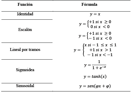 Paso 4. Aplicar a cada nodo la ecuación que transformará cada variable dentro de la RNA, algunas de ellas se pueden ver a continuación en la Tabla 1.