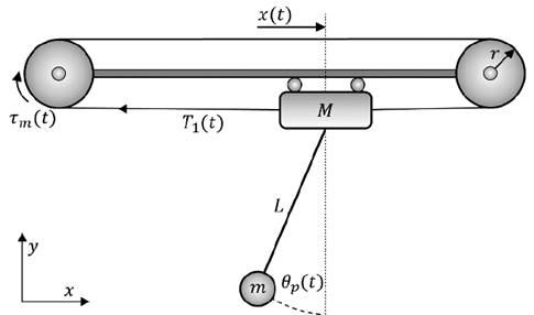 El modelo estudiado describe la posición angular de la carga θp(t) en radianes respecto al eje vertical que acompaña a la carretilla. La carretilla es halada por una tensión T 1 a lo largo de un soporte, generando un desplazamiento lineal x(t)