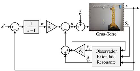 El esquema de control propuesto se enfoca principalmente en mejorar la estimación de las variables de estado y las perturbaciones a las que está sometido el sistema, en especial las provenientes de la oscilación de la carga que en general se componen principalmente por la frecuencia de oscilación pendular de la carga que puede ser ocasionada por perturbaciones externas o internas como la inercia del propio sistema cuando la carretilla se está posicionando. Para lograr esto, el observador de estado extendido usado convencionalmente en ADRC es modificado para incluir un modelo interno que describe una señal armónica con frecuencia 𝜔 𝑟 (también llamado resonador). Luego, las estimaciones de la perturbación y las variables de estado, se usan en la ley de control para rechazar en línea la perturbación y acomodar la dinámica de lazo cerrado, respectivamente.
