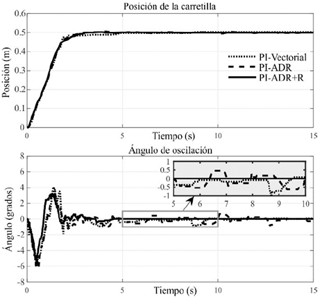 En esta prueba se analiza el desempeño y robustez presentados por los sistemas de control ante una entrada tipo paso, cuyo objetivo es posicionar la carretilla en una referencia de 𝑥 ∗ =0.5𝑚 y estabilizar la carga en el punto 𝜃 𝑝 =0. En la Fig. 5, se presenta la respuesta de cada sistema de control para el posicionamiento de la carretilla y de la carga. En esta figura, se puede evidenciar el buen desempeño que presenta la propuesta de control respecto a las otras técnicas. Observe que las oscilaciones de la carga que presentan los controladores PI-ADR y PI-Vectorial en el periodo de tiempo de (5s-10s) están dentro del rango de (±0.5°) y (±1°), respectivamente; mientras que el controlador