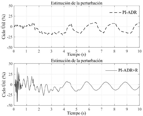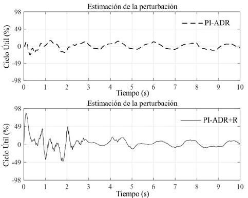 En la Fig. 8, se presenta la respuesta de cada sistema de control durante la estabilización de la carga. En esta figura, se puede apreciar cómo el controlador PI-ADR+R atenúa de mejor forma las oscilaciones en la carga en comparación con los otros controladores. Observe que la carga en el periodo de tiempo (5s-10s) presenta menores amplitudes de oscilación en comparación a los otros sistemas de control, mostrando así un mejor desempeño para atenuar las oscilaciones en la carga. En la Fig. 9, se presenta la estimación de la perturbación obtenida por los sistemas de control PI-ADR y PI-ADR+R durante la prueba. En la Fig. 10, se presentan las señales de control de cada esquema de control. En esa figura, se puede apreciar que el controlador PI-ADR+R presenta menores valores pico en la señal de control aplicada al actuador.