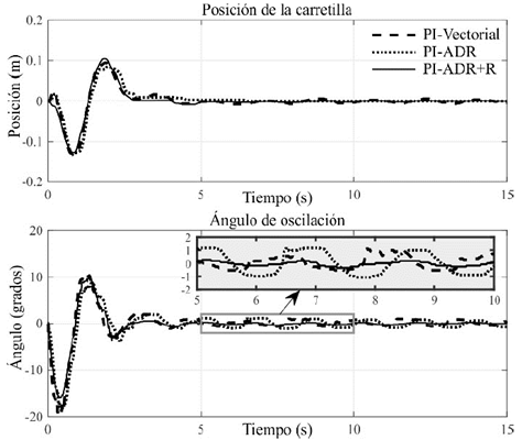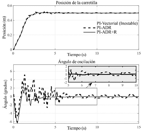 Adicionalmente, la Fig. 11 muestra que el desempeño del esquema PI-ADR se ve afectado (dada la incertidumbre del sistema), mostrando gran cantidad de variaciones en el ángulo de oscilación de la carga y en el posicionamiento de la carretilla. Esto muestra que el aniquilador propuesto en ec. (29) proporciona mejores resultados que el modelo interno convencional usado en esquemas clásicos ADRC como el mostrado en la sección 4.