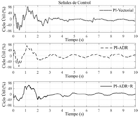 La Tabla 4 muestra el resumen de los índices de desempeño encontrados. Para facilitar el análisis de la tabla, los índices de desempeño se ponderan en términos porcentuales relativos a los obtenidos por el esquema de control propuesto (PI-ADR+R). Así entonces, se puede notar que en los tres casos experimentales, la estrategia de control propuesta tiene mejor desempeño en términos de atenuación de oscilaciones en la carga y además se logra usando menor cantidad de energía de control.