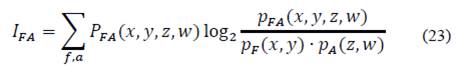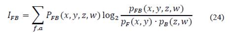 Mutual Information (MI) is derived from information theory and quantifies the amount of information obtained about one variable from another variable. Thus, FMI quantifies the amount of image features transferred from the source images into the fused image. Gradient maps represent the images’ features because they contain information about edges, directions, texture, contrast, and pixel neighborhoods [37]. Like classic approaches used to estimate MI, FMI estimation is based on the calculation of the joint probability distribution functions. Assuming the intensity pixels of the fused image 𝐹 𝑥,𝑦 and input images 𝐴(𝑧,𝑤) and 𝐵(𝑧,𝑤), the methods use the normalized values of gradient magnitude image features, like marginal distributions, and therefore the amount of feature information in the fused image 𝐹 from input images 𝐴 and 𝐵 is given by [37]: